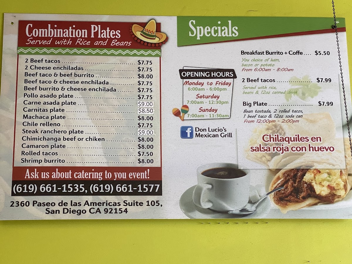 Don Lucio’s Mexican Grill offers a straightforward, welcoming menu that captures the heart of traditional Mexican and Latin American flavors. The menu features a variety of comforting dishes perfect for any time of day—from hearty breakfast burritos and chilaquiles that start your morning right, to satisfying lunch and dinner options like adobada burritos, rolled tacos, and flavorful birria.
